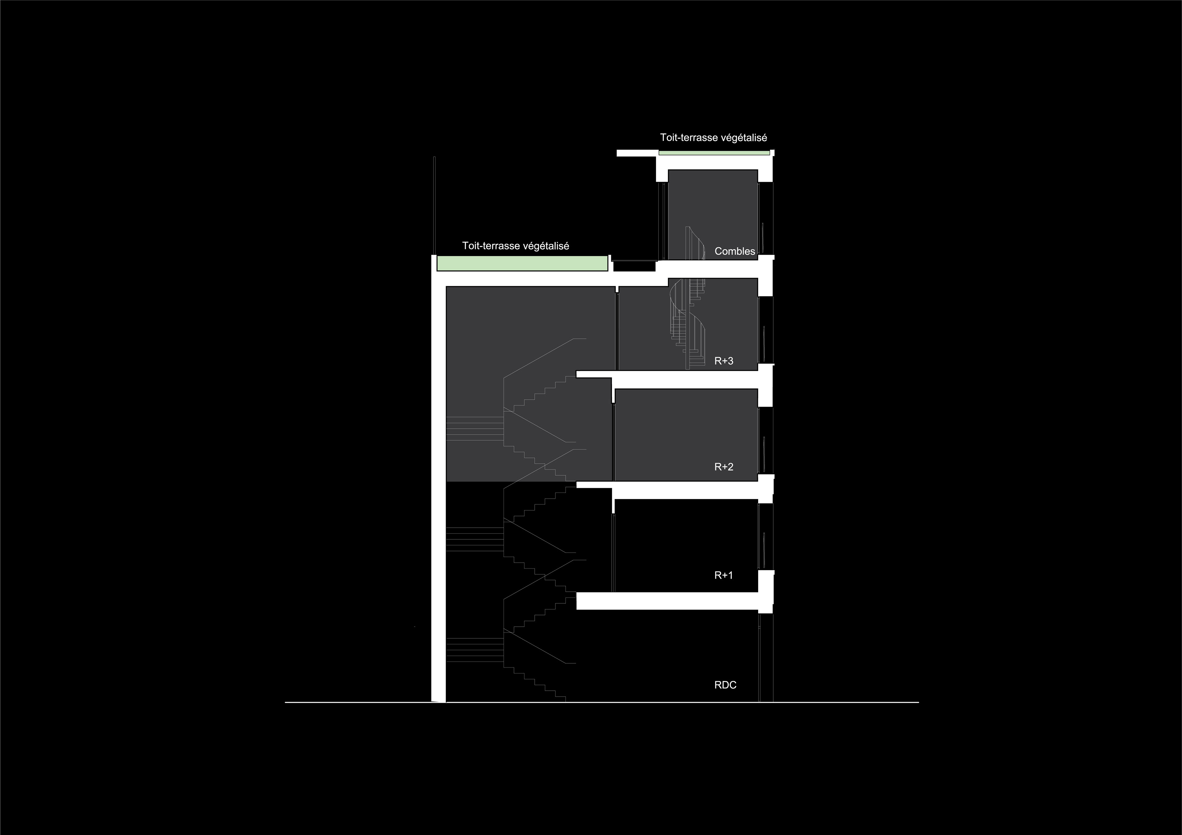 Il s'agit d'un projet de surélévation, situé en banlieue parisienne dans la ville d’Aubervilliers (93). Le projet consiste principalement en la création de 2 étages et d'un niveau de combles, sur les deux niveaux existants, afin d’y accueillir un cabinet d'avocats. En raison de la proximité du bâtiment avec l’église Notre-Dame-des-Vertus (monument historique protégé), une attention particulière a été menée sur la qualité architecturale du projet, afin que la proposition soit en cohérence avec l’existant et s’insère de façon harmonieuse dans le paysage urbain du centre historique d’Aubervilliers. Le projet prévoit deux grands toits-terrasses végétalisés couvant une surface de plus de 35 m², et une terrasse accessible en partie couverte par une pergola.