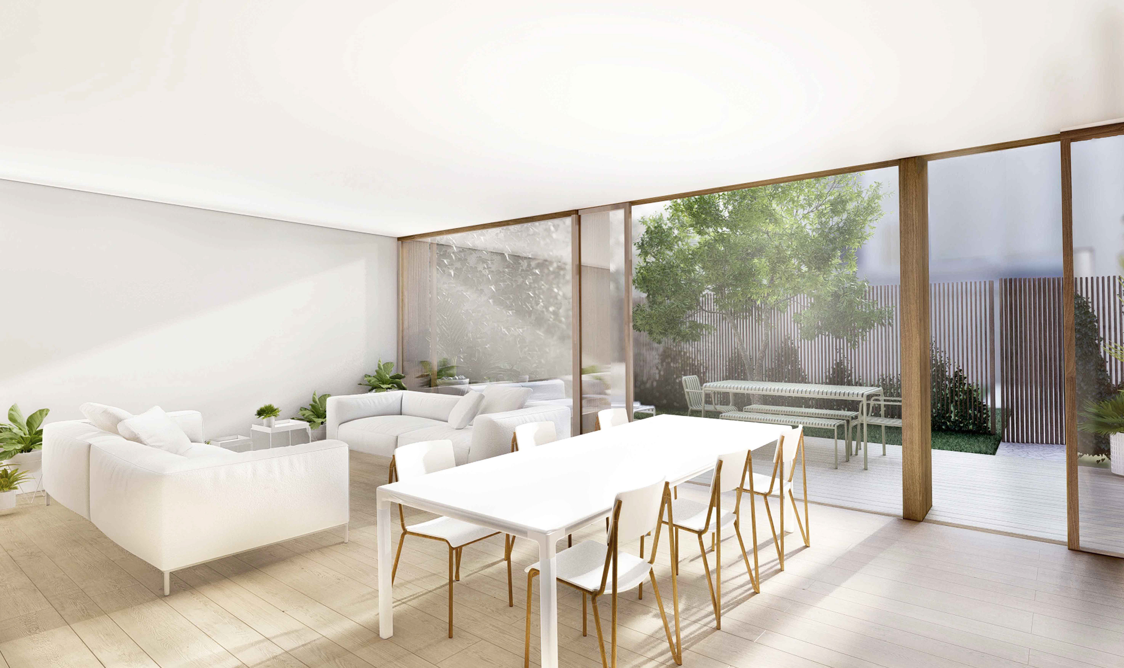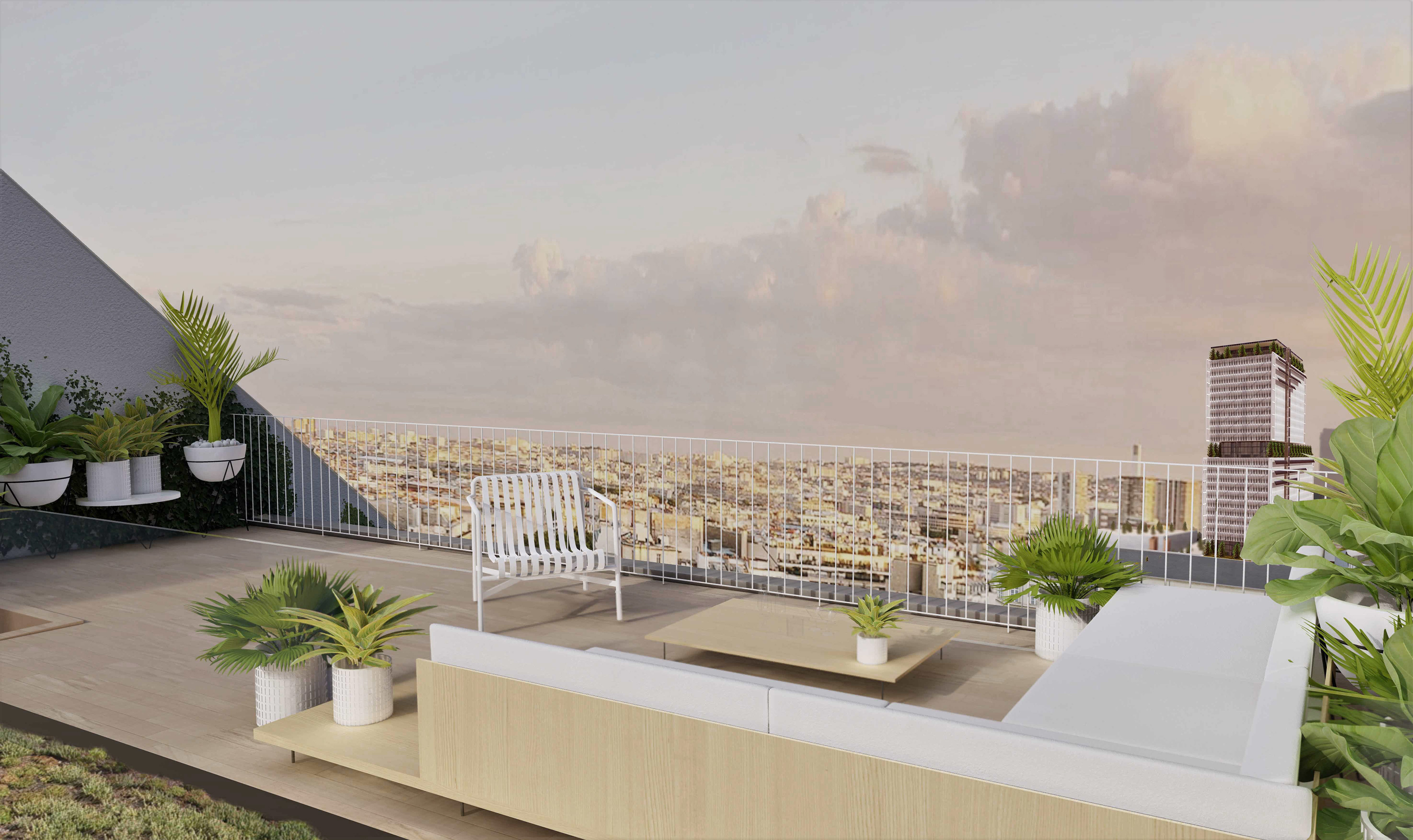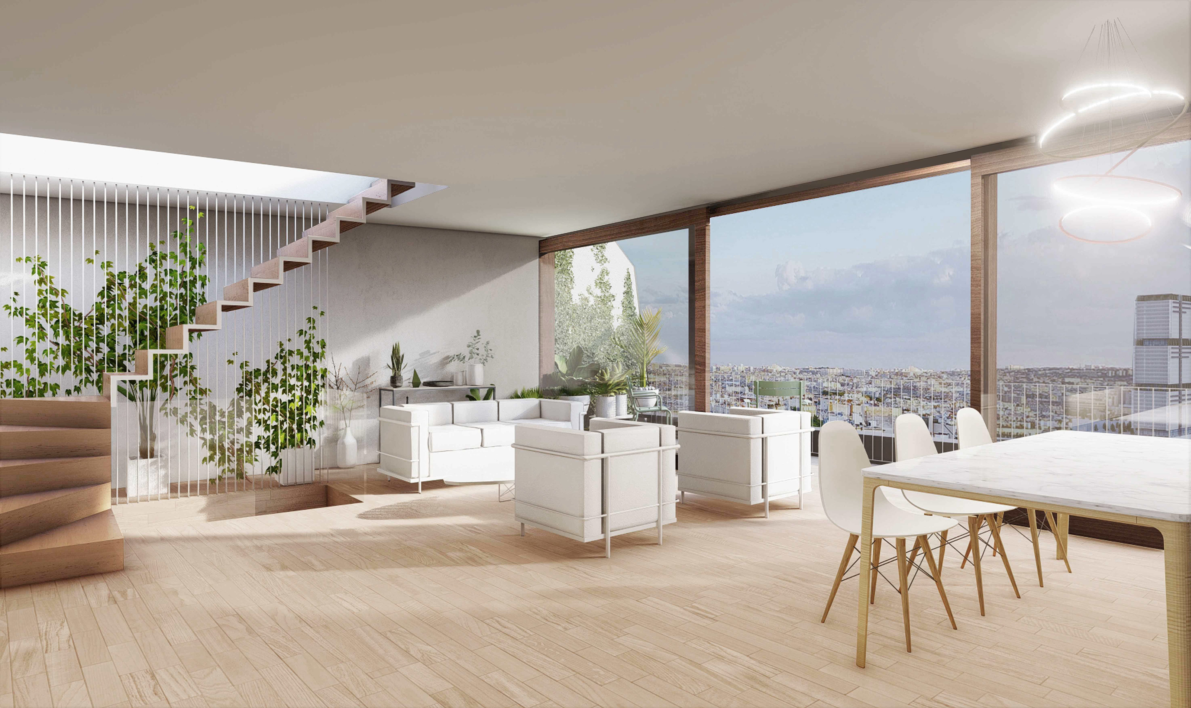 Les appartements au nombre de 4, sont constitués d’un T1, de deux T2 et d’un T5. L’appartement situé aux derniers étages profite d’un balcon filant et d’un toit-terrasse accessible en partie végétalisé. Les espaces extérieurs se définissent comme un prolongement des espaces intérieurs, où se dégagent des vues lointaines sur les villes de Clichy et de Paris. Le séjour bénéficie d’un espace dégagé et lumineux, grâce à sa grande baie vitrée orientée sud-ouest. Le bâtiment a bénéficié d’une rénovation énergétique complète répondant aux normes RE2020, principalement centrée sur son enveloppe extérieure. Des matériaux biosourcés ont été mis en œuvre, tels que des isolants en fibre et laine de bois, ou issus d’un mélange de coton, de lin et de chanvre.