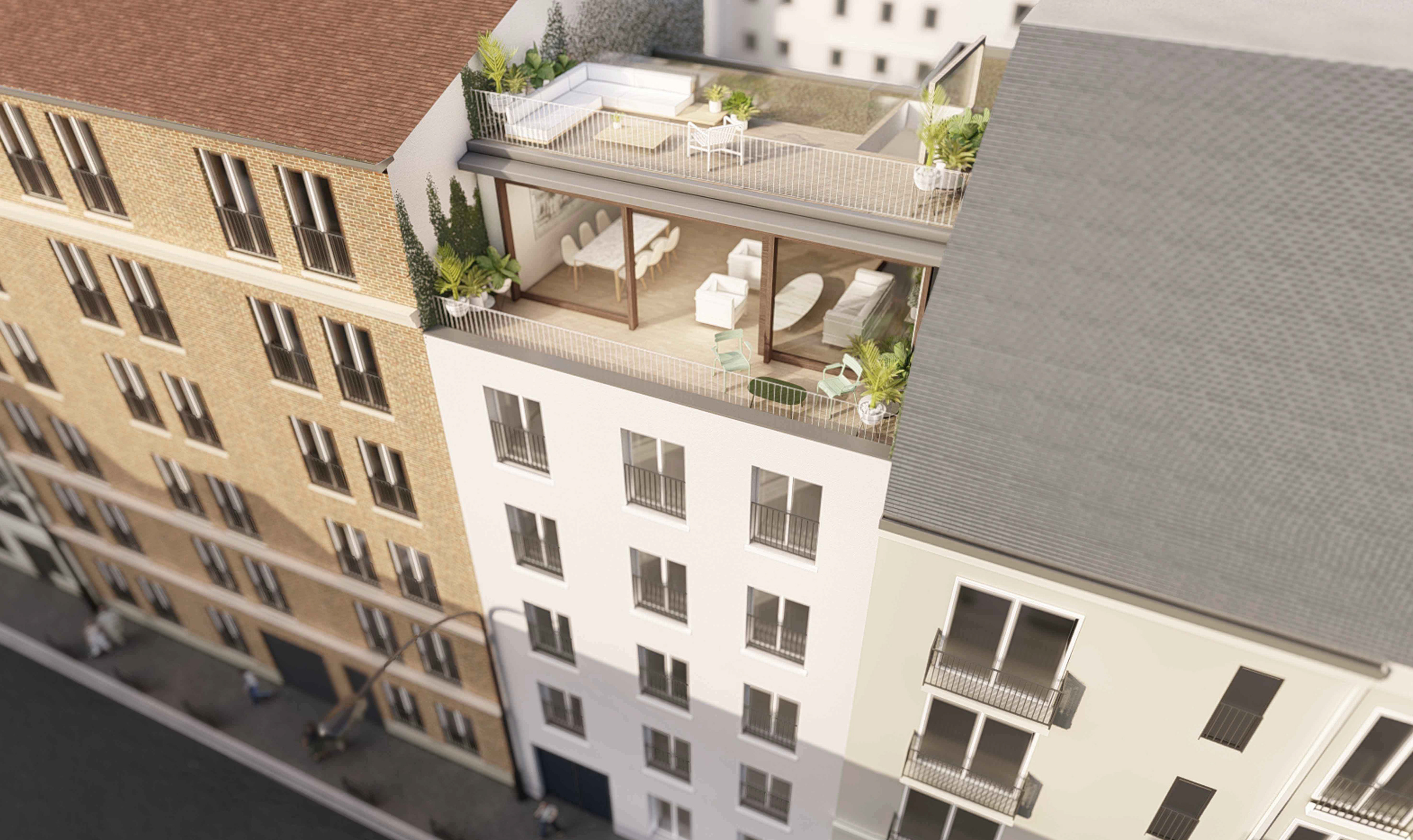 Le site étant situé dans un secteur protégé par les monuments historiques en raison de sa proximité avec le centre-ville de Clichy, notre équipe de maîtrise d’œuvre s’est évertuée à développer le projet en symbiose avec les Architectes des Bâtiments de France et le service d’urbanisme de la mairie. L’immeuble sur rue est un bâtiment issu des faubourgs des années 1850-1870 s’élevant sur 4 niveaux existants, et dont les immeubles adjacents profitent chacun de 2 niveaux supplémentaires. La dent creuse ainsi créée a été identifiée comme une opportunité par les différents acteurs du projet, qui a été mise à profit par la création d’une surélévation. L’architecture proposée, aux lignes simples et épurées, apporte une note contemporaine au bâti existant, tout en s’intégrant de façon discrète et harmonieuse au tissu faubourien.