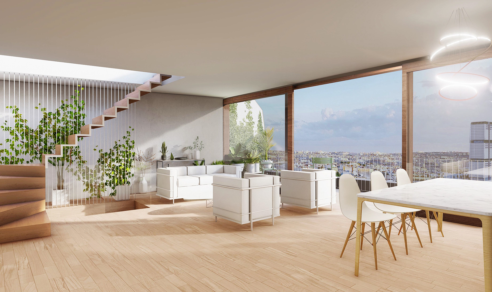 Le séjour situé au dernier étage, bénéficie d’un espace dégagé et lumineux, grâce à sa grande baie vitrée orientée sud-ouest.