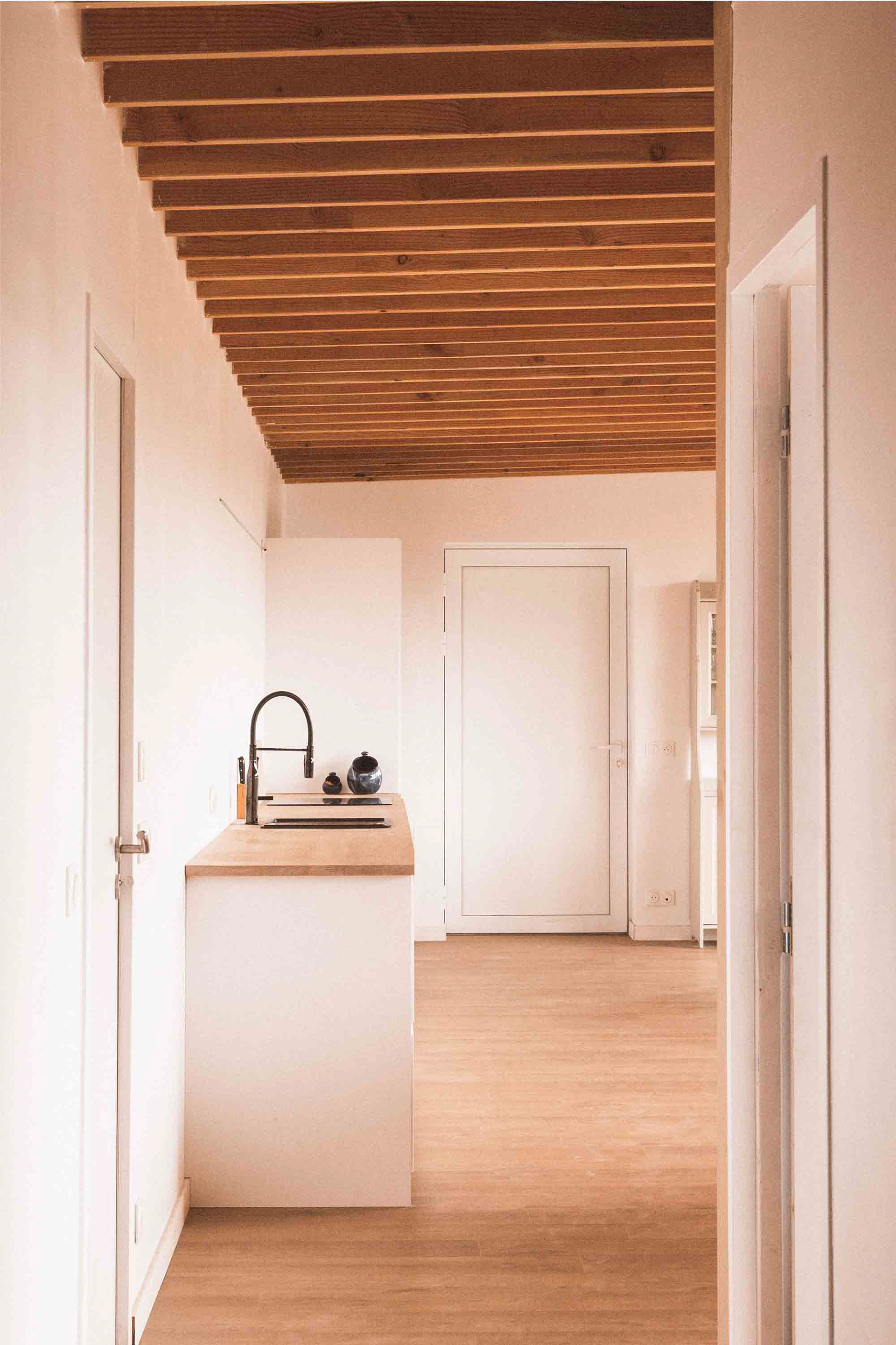Le choix de matériaux écologiques, biosourcés et d’origine locale, a permis de maximiser le confort thermique : les variations de chaleur sont contenues par les isolants en fibre et laine de bois situés à l’intérieur des murs et du plafond.