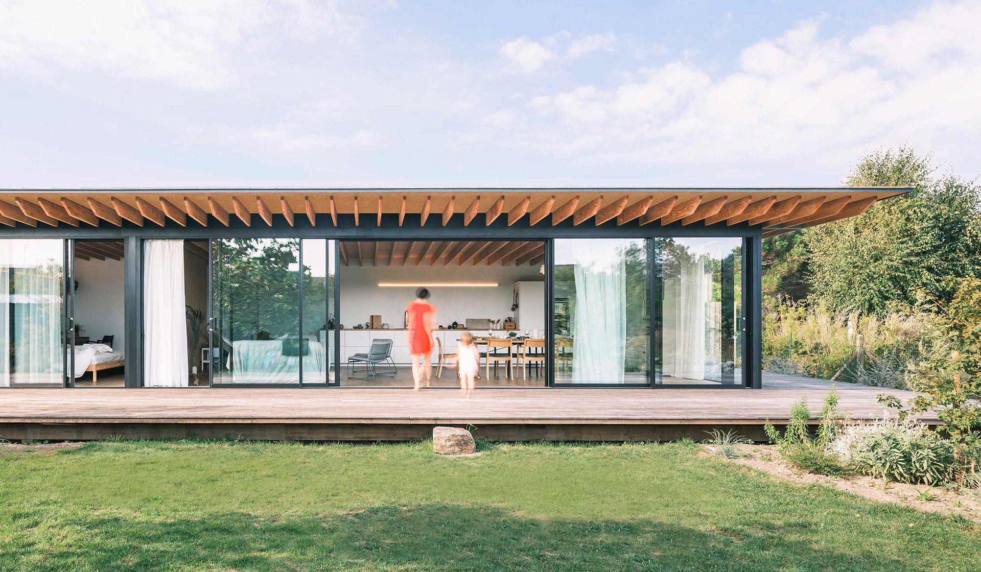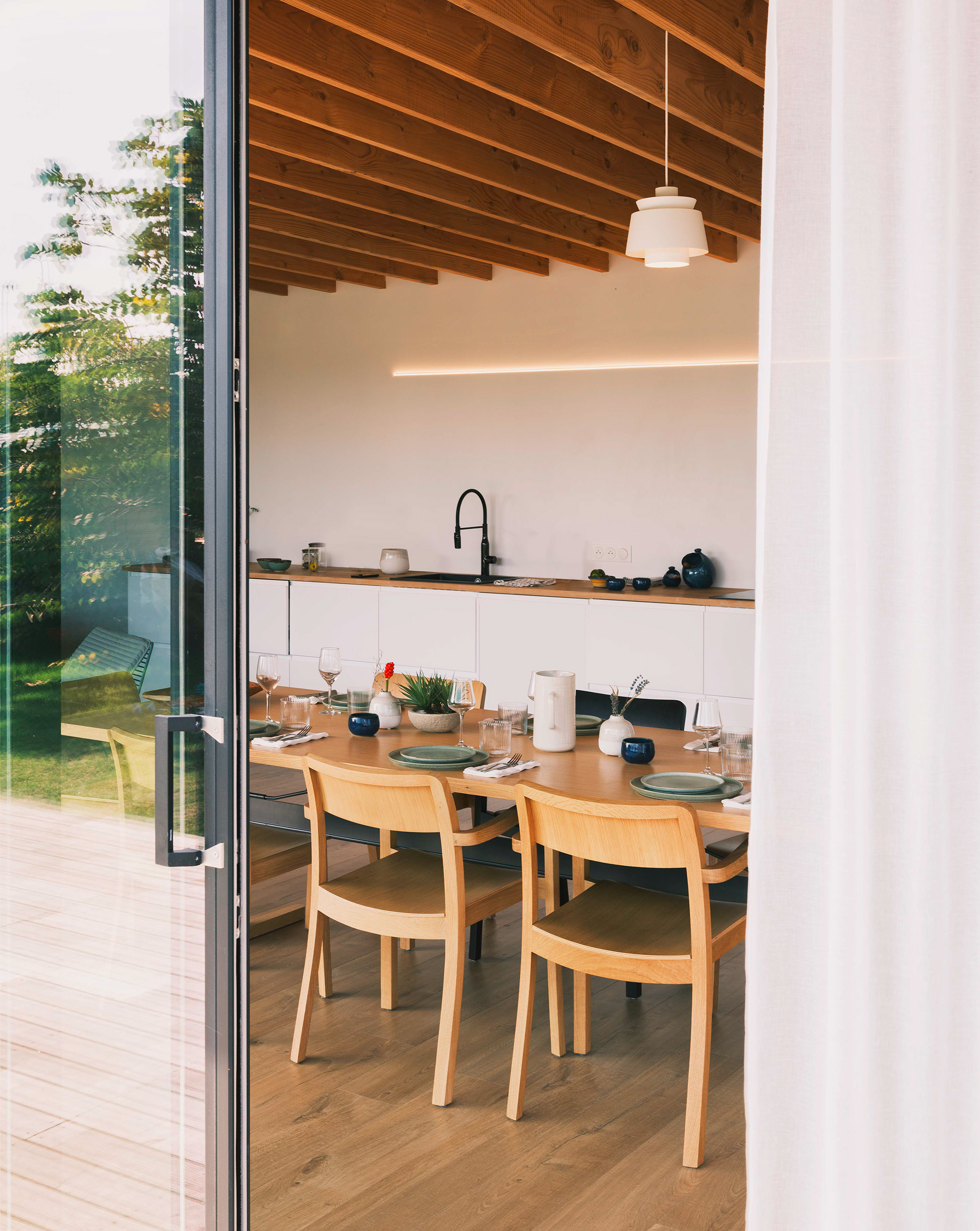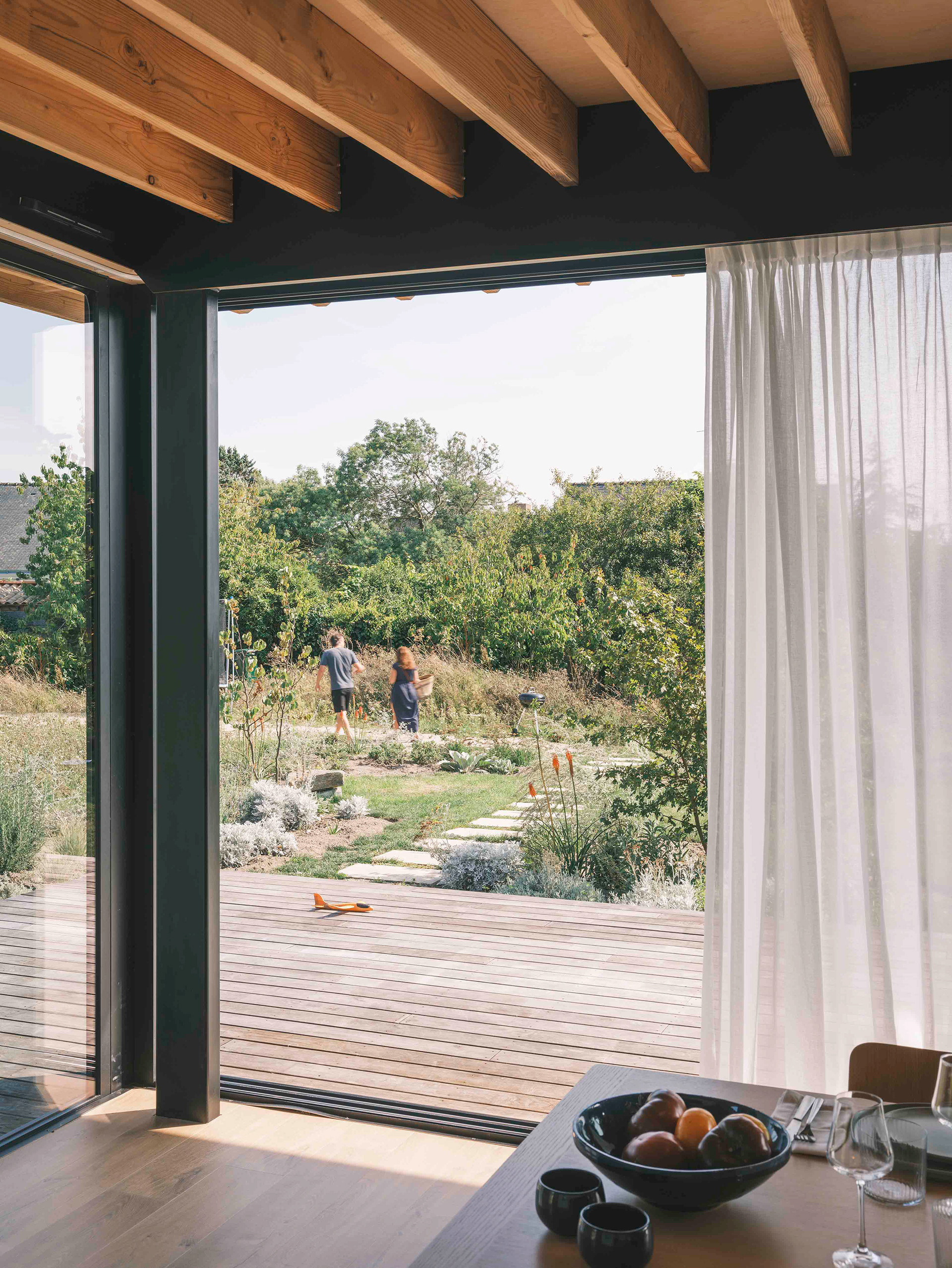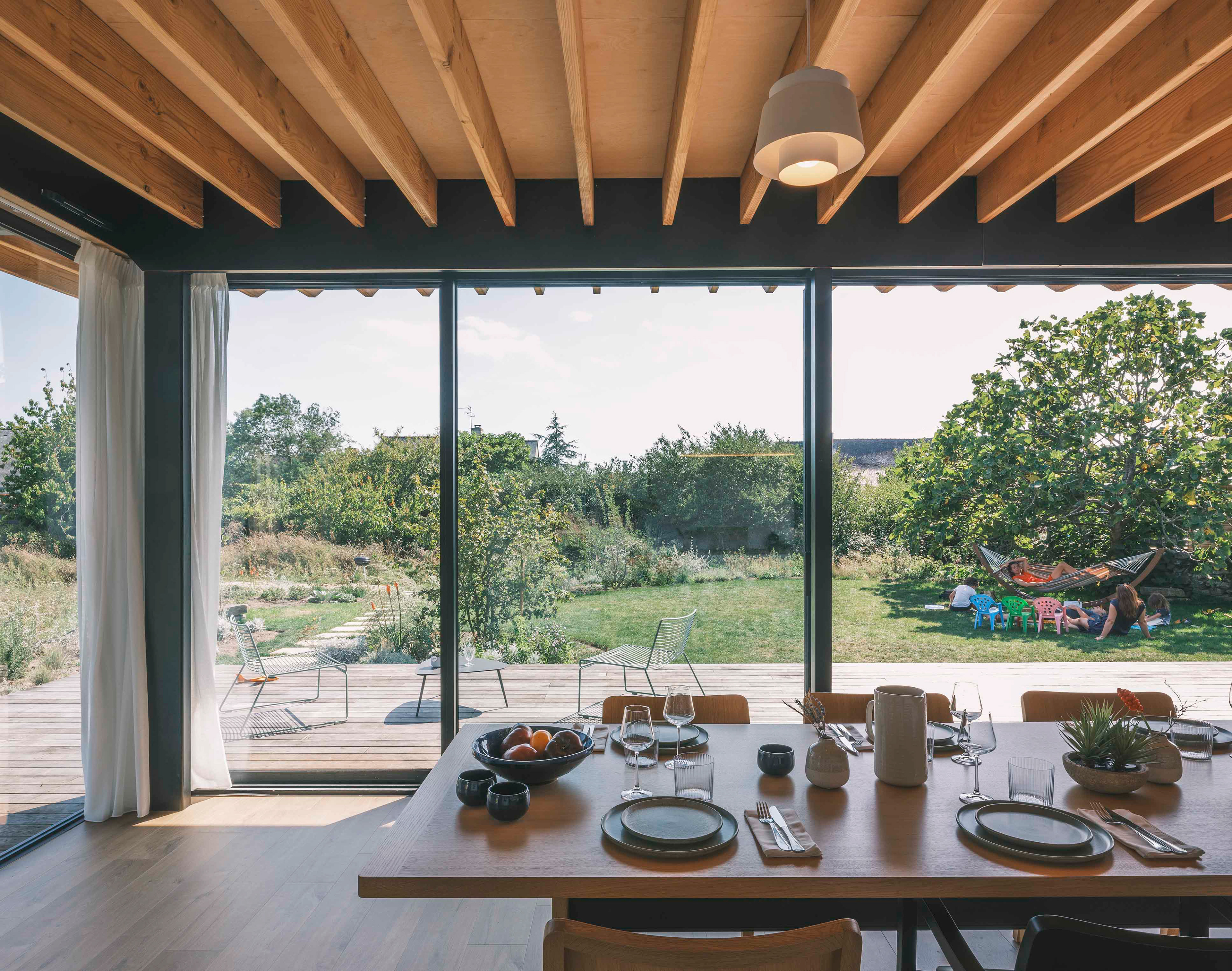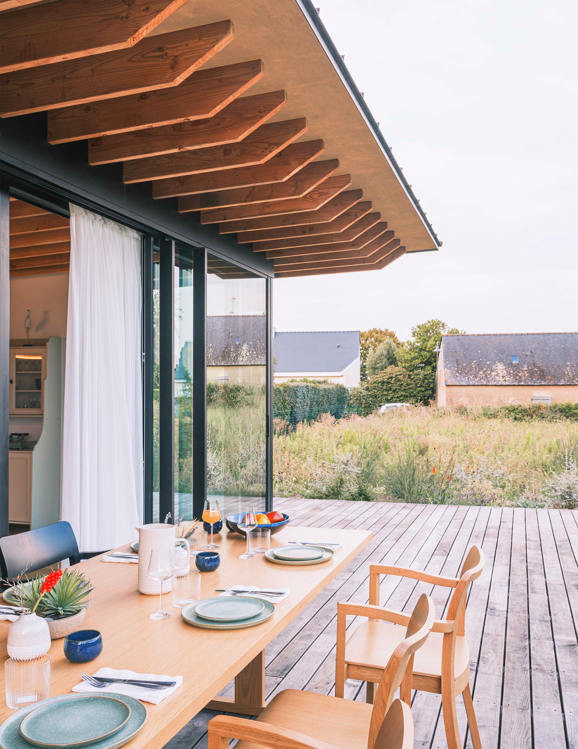 La terrasse se définit comme une extension de l’espace intérieur : le seuil filant et l’ouverture aux deux tiers de la baie vitrée du séjour (qui s’étire sur de plus de dix mètres de long) permettent aux usagers de profiter d’une sensation spatiale décuplée, où espace, lumière et nature entrent en osmose. Cette projection visuelle est accentuée par le jeu des poutres et du plafond en bois qui traversent les pièces et se prolongent vers l’extérieur sans marquer d’arrêt.