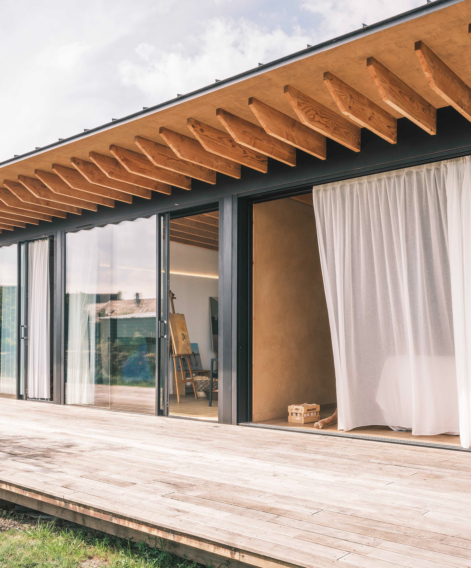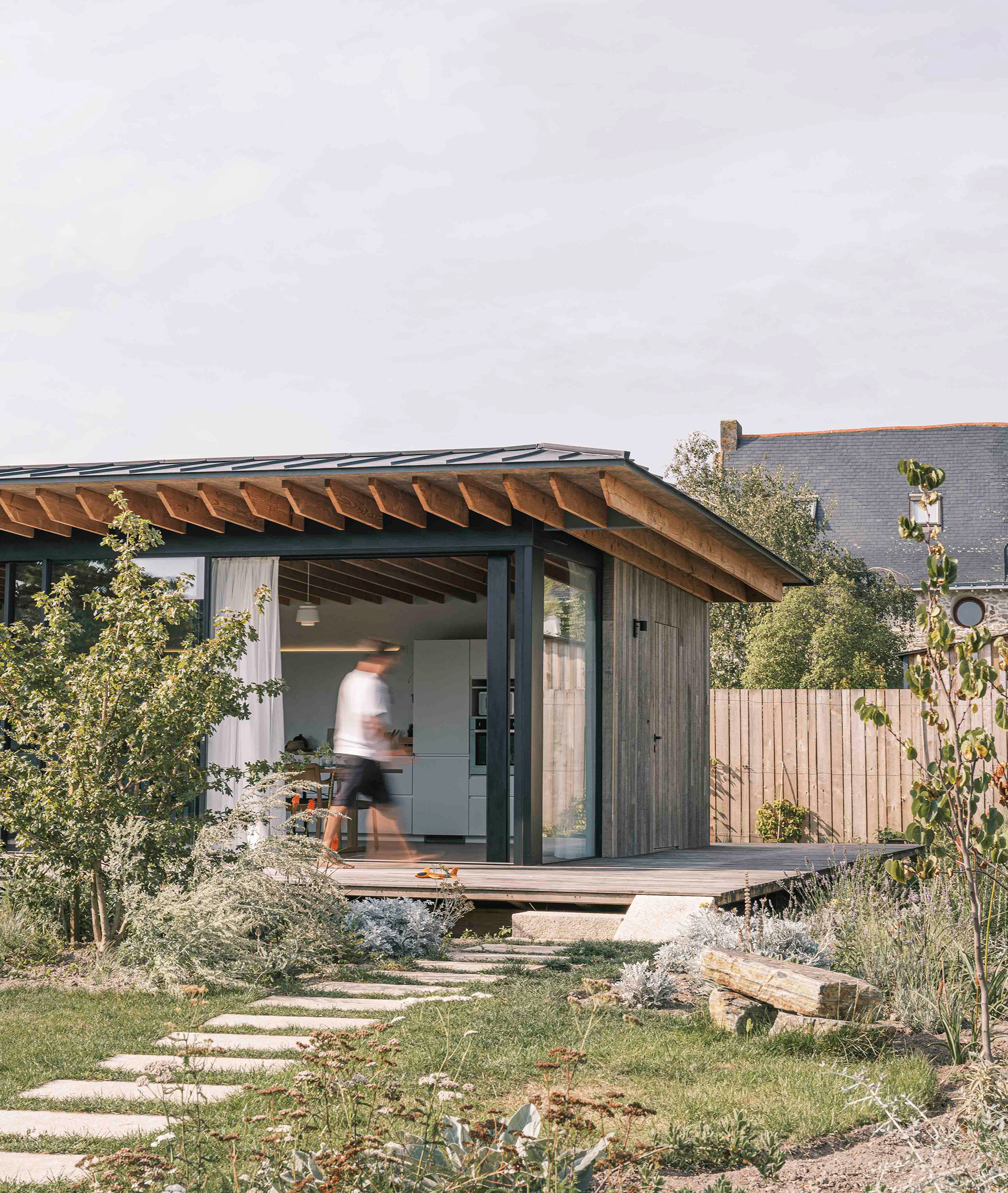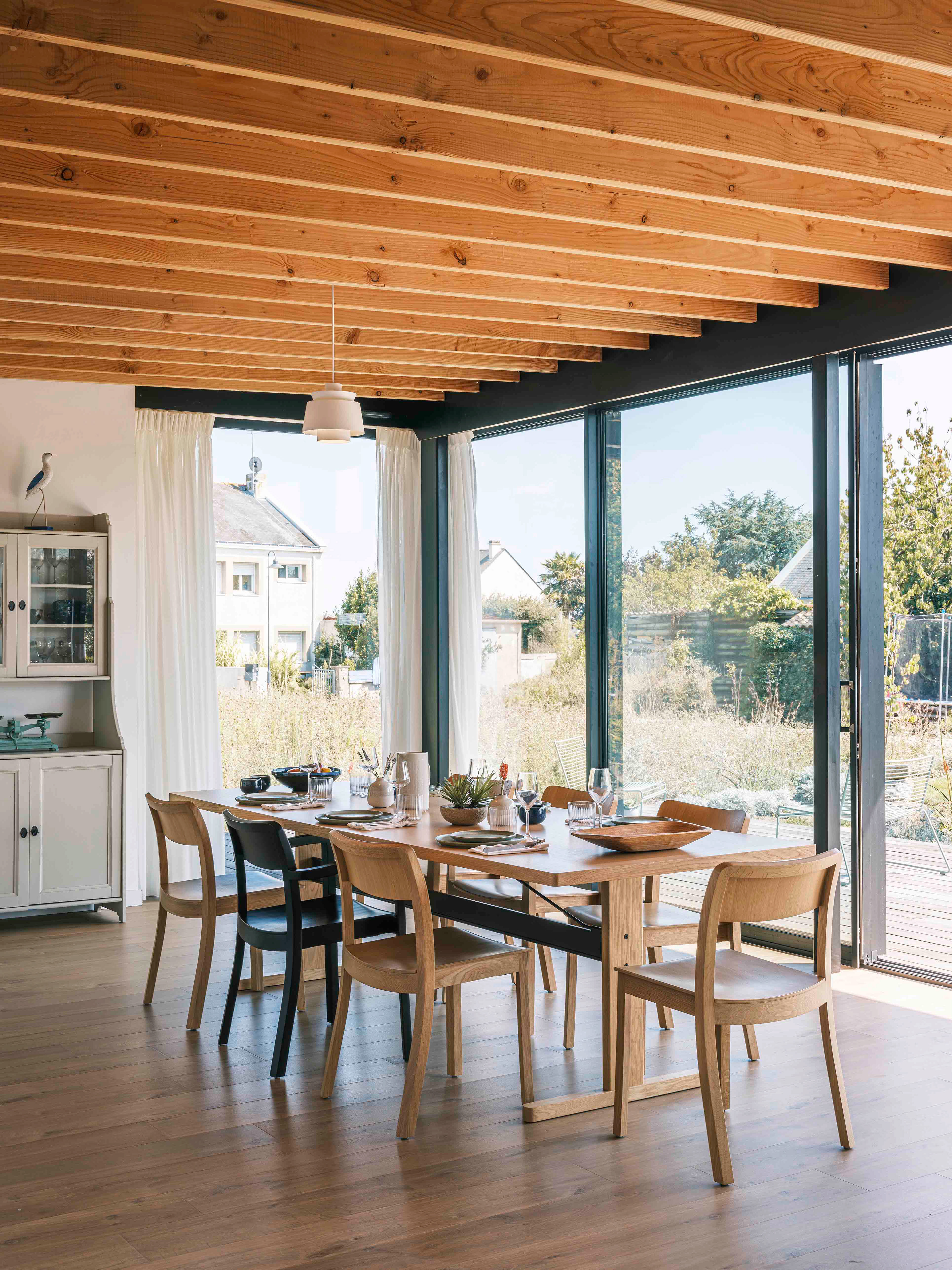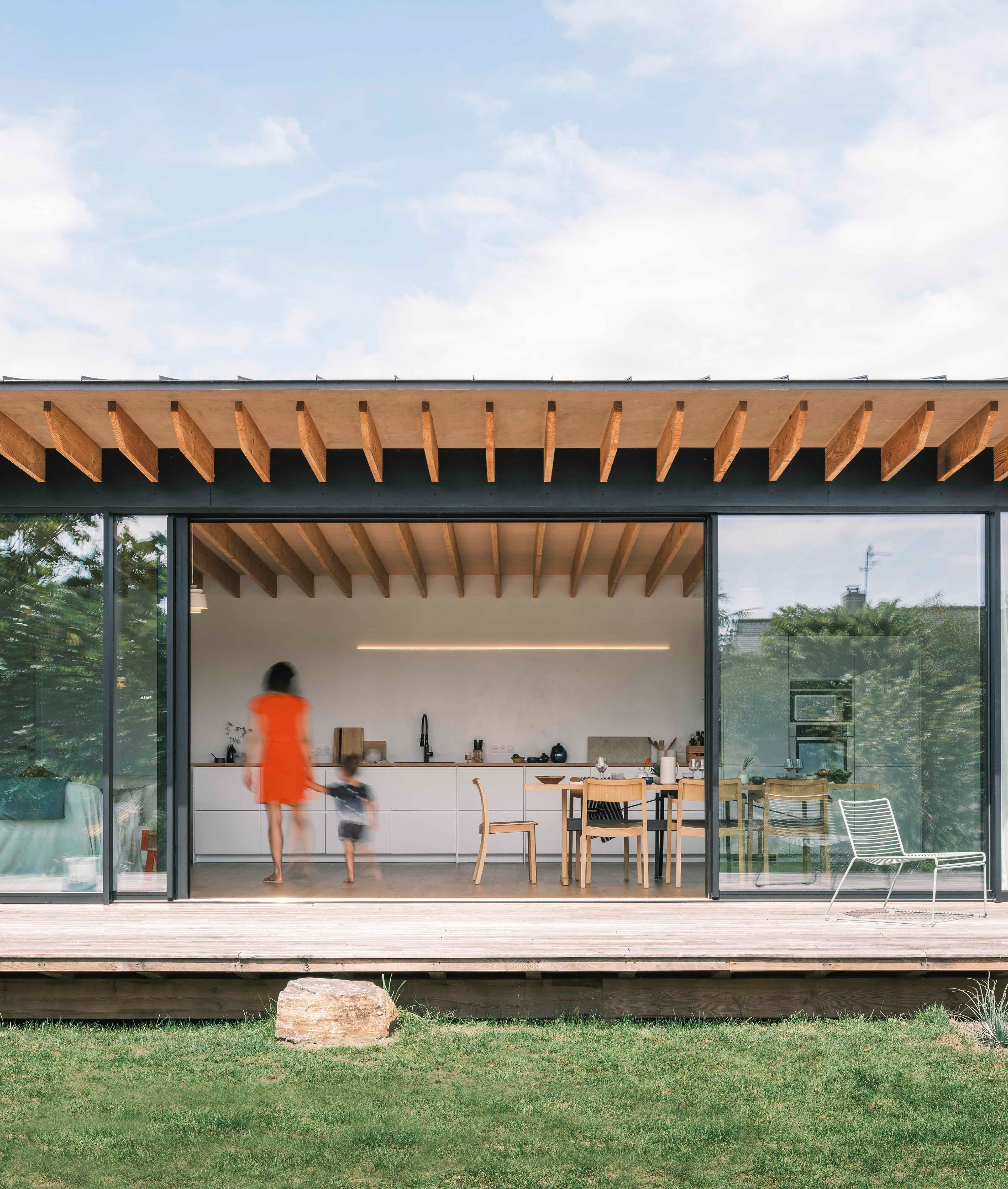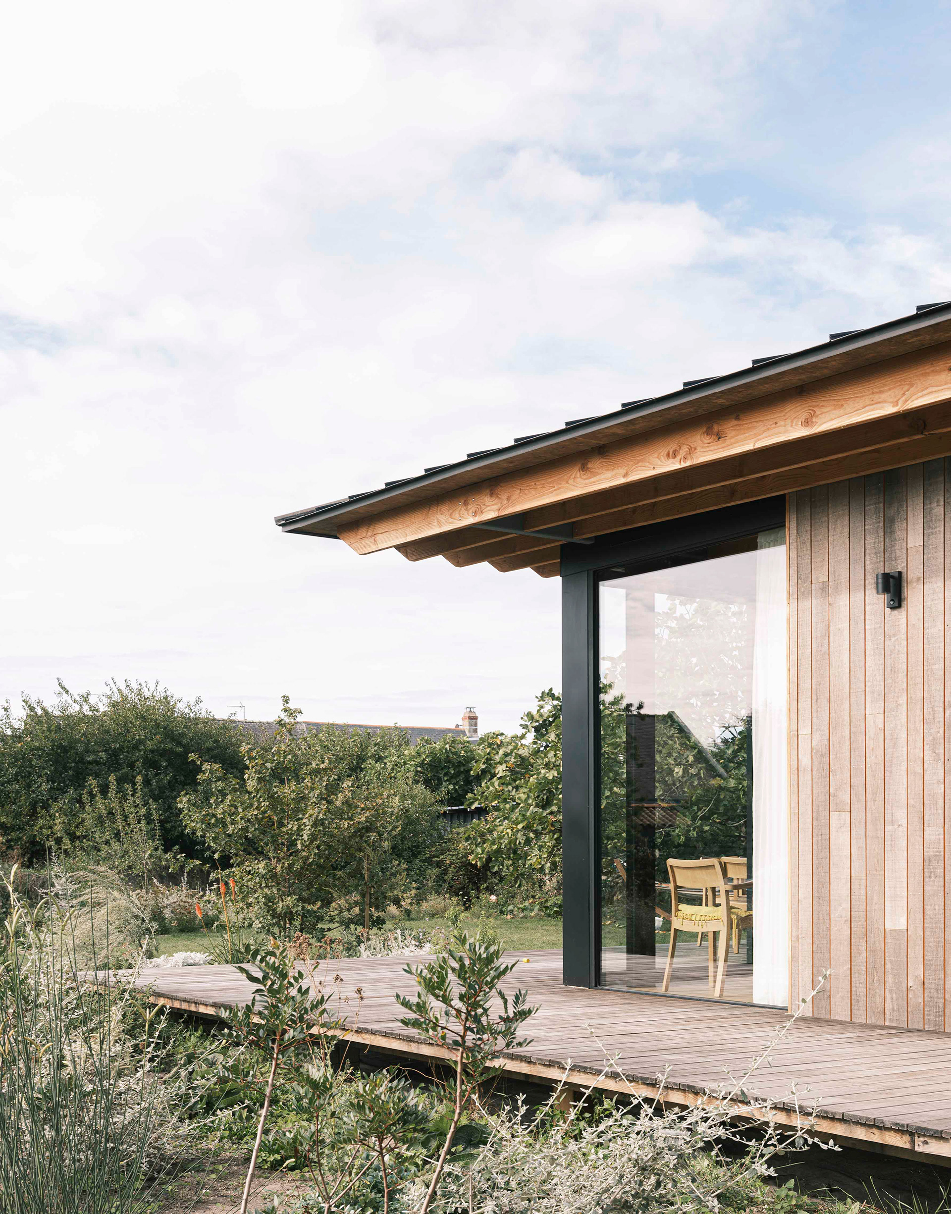 La terrasse se définit comme une extension de l’espace intérieur : le seuil filant et l’ouverture aux deux tiers de la baie vitrée du séjour (qui s’étire sur de plus de dix mètres de long) permettent aux usagers de profiter d’une sensation spatiale décuplée, où espace, lumière et nature entrent en osmose. Cette projection visuelle est accentuée par le jeu des poutres et du plafond en bois qui traversent les pièces et se prolongent vers l’extérieur sans marquer d’arrêt.