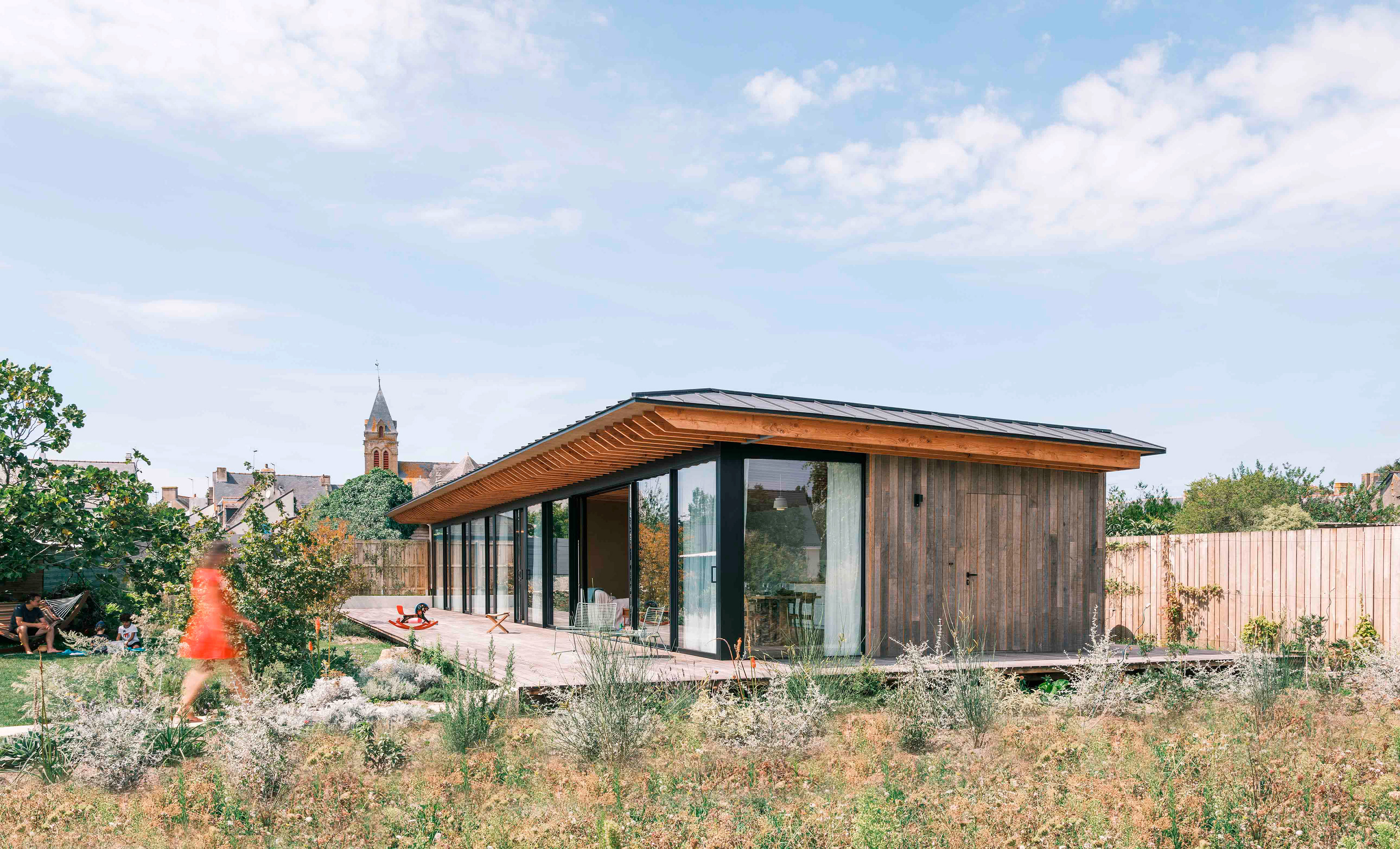Cette maison se situe dans le cœur historique du village de Saillé (44), à proximité immédiate des marais salants de Guérande. L’insertion du projet dans le paysage a amené les architectes à concevoir une architecture de faible hauteur, créant ainsi une forme unique qui semble avoir été étirée au gré des vents. Faite de bois et de verre, elle a été pensée de façon à ce que les espaces intérieur et extérieur ne forment qu’une seule et même entité.