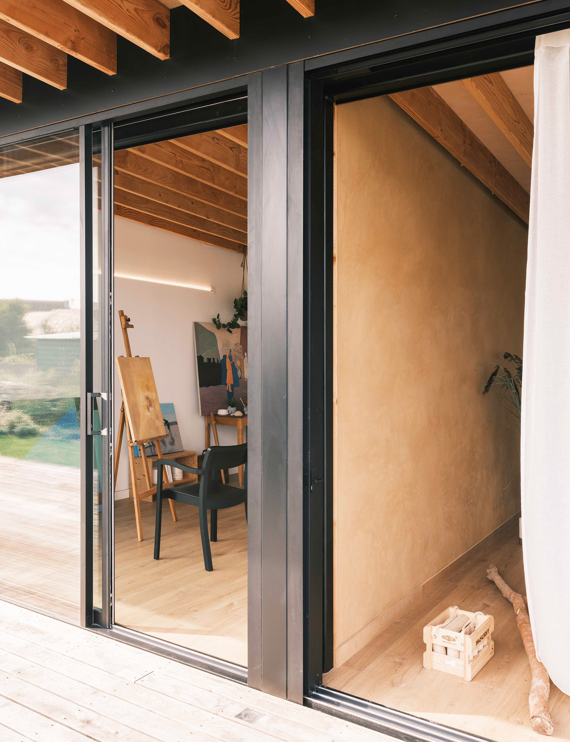 Le choix de matériaux écologiques, biosourcés et d’origine locale, a permis de maximiser le confort thermique : les variations de chaleur sont contenues par les isolants en fibre et laine de bois situés à l’intérieur des murs et du plafond.