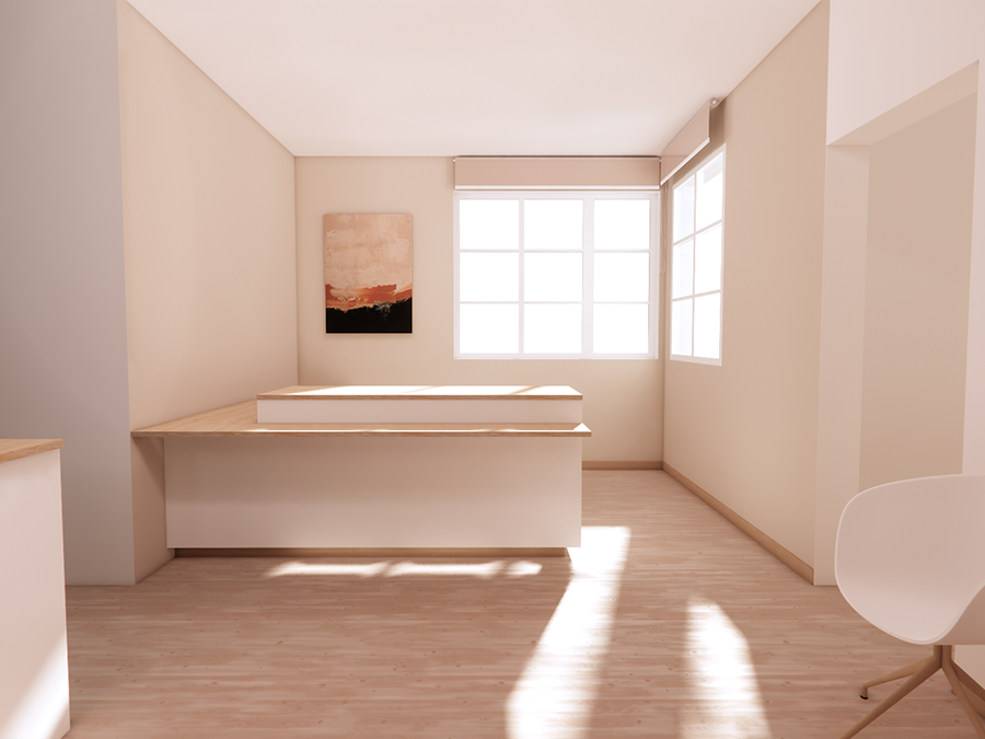 Le caractère résolument épuré de l’espace crée une forme d’abstraction, rendue possible par le travail de la lumière, des couleurs et des contrastes : les surfaces des murs et des plafonds sont travaillées comme les éléments principaux d’apport de lumière indirect qui, de par leur couleur blanche, créent un effet enveloppant amenant de la douceur à l’espace. Cet effet est renforcé par le travail du sol qui, en accueillant l’ensemble des réseaux, a permis de rendre invisible les infrastructures. L’espace ainsi dégagé de toutes contraintes techniques, donne à voir un ensemble homogène, apportant sérénité et calme au regard comme à l’usage. La couleur chaude du bois rend naturellement l’espace chaleureux.
