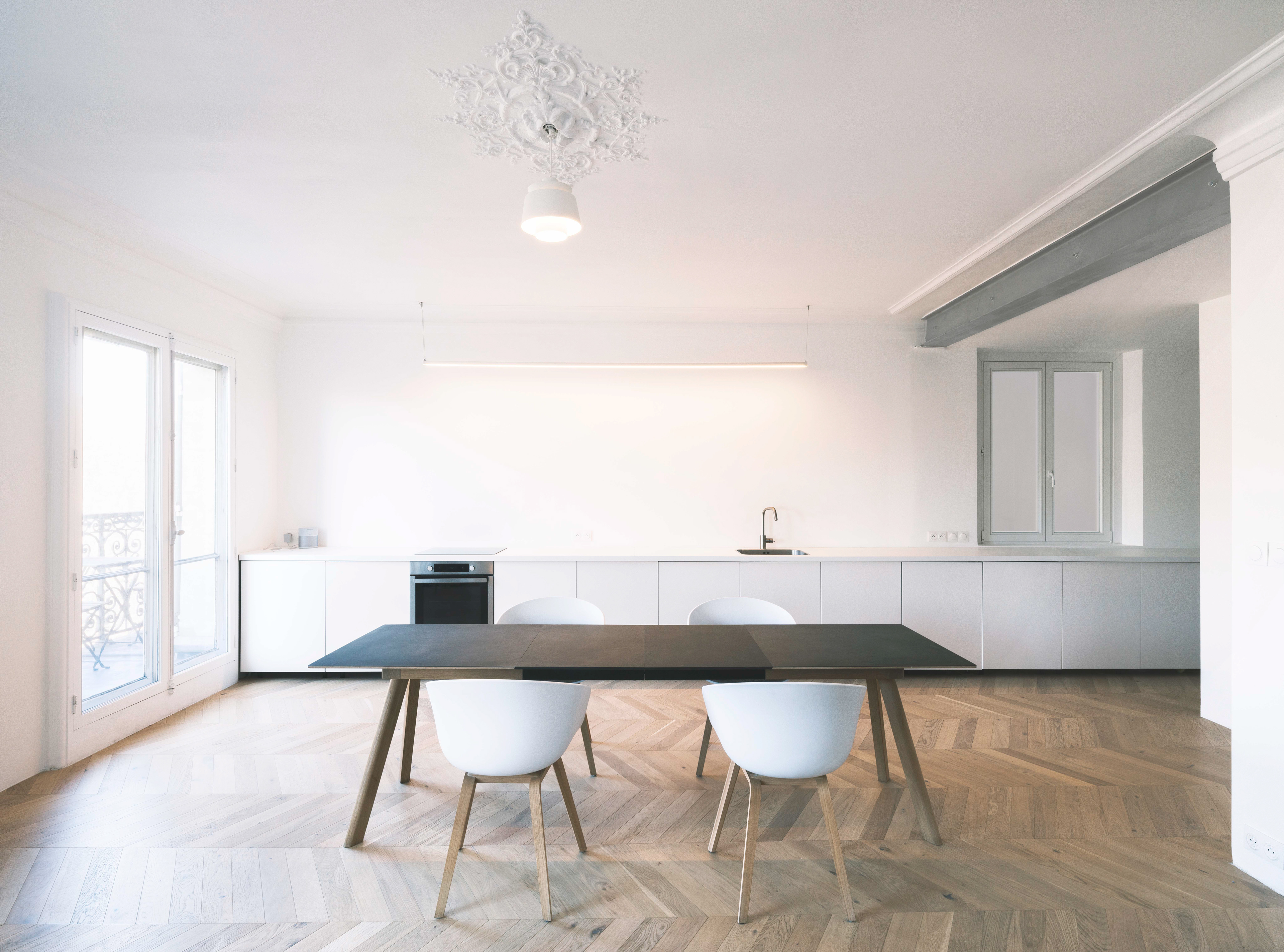 La cuisine ouverte sur le séjour se définit comme un élément fort du projet, permettant de maximiser les sensations spatiales et de lumière. De couleur blanche, il se compose uniquement d’éléments bas et structure l’espace par sa linéarité. Les effets de perspective qu’il crée au sein de l’espace habité, permettent de maximiser les vues sur l’extérieur, notamment depuis l’entrée où l’on aperçoit le balcon, puis la cime des arbres et le ciel. Un rapport privilégié avec les éléments naturels est ainsi entretenu, et permet aux usagers de jouir d’une qualité spatiale propre aux immeubles haussmanniens.