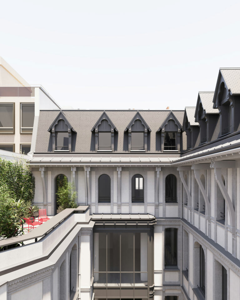 Côté rue, la façade est rénovée afin de valoriser et de redonner de l’éclat aux façades en pierre existantes, aux balcons en fer forgé, à la toiture mansardée et à ses lucarnes ; les menuiseries sont remplacées par des menuiseries en bois plus performantes thermiquement ; les équipements techniques situés en toiture sont supprimés et replacés dans des espaces ventilés sous toiture, afin de redonner une cohérence d’ensemble à la volumétrie de la toiture. Côté cour, des façades vitrées sont mises en place au niveau du socle du bâtiment, marquant discrètement la transition entre les espaces intérieurs et extérieurs - le nouveau jardin d’agrément ainsi créé, propose un nouveau lieu de sociabilité servant d’ilot de fraîcheur l’été aux usagers.